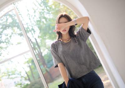 更新 《孙允珠2015.ShesComing - 2015.10▼SonYounJu▲ 2015.10.03 ┇ShesComing┇『渐变雪花灰古铜珍珠短款T』》