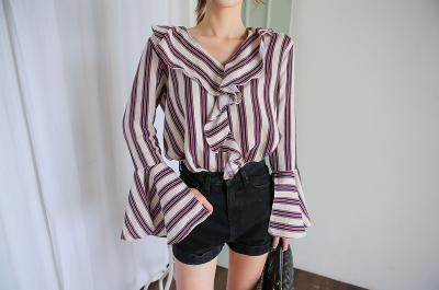 更新 《孙允珠2016.Babi&Pumkin - 2016.08▼SonYounJu▲ 2016.08.14 ┇Babi&Pumkin┇『复古摩登V领荷叶阔袖条纹衬衫』》